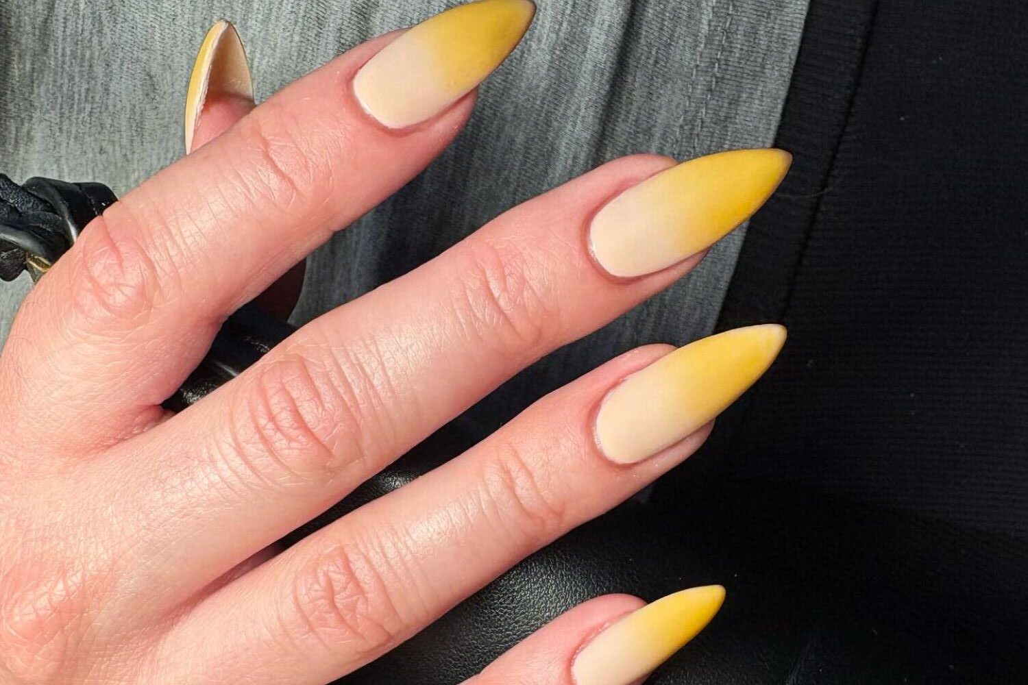 These yellow and blue ombre nails are reimagined here as a rich yellow fade into pale bases. The ombre effect creates a subtle warmth, perfect for trendy yellow nails or yellow nail ideas in autumn. Ideal for almond-shaped nails and cooler skin tones.