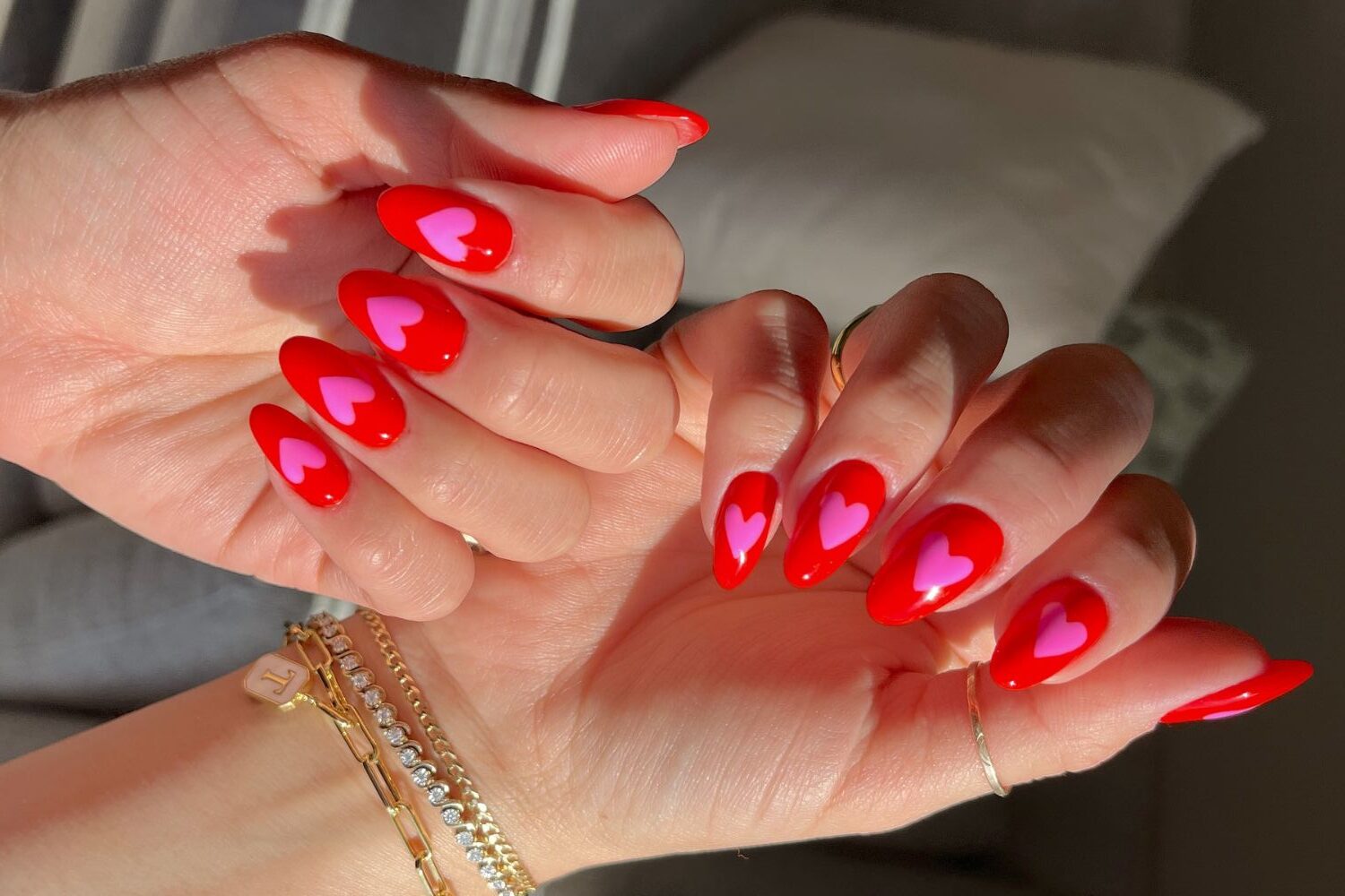 Classic red polish meets bright pink hearts in this bold and confident look. The high-gloss finish and consistent heart design across all nails create a visually striking effect that’s perfect for anyone wanting cute valentines nails with major impact. Best suited for medium almond shapes and warmer skin tones.
