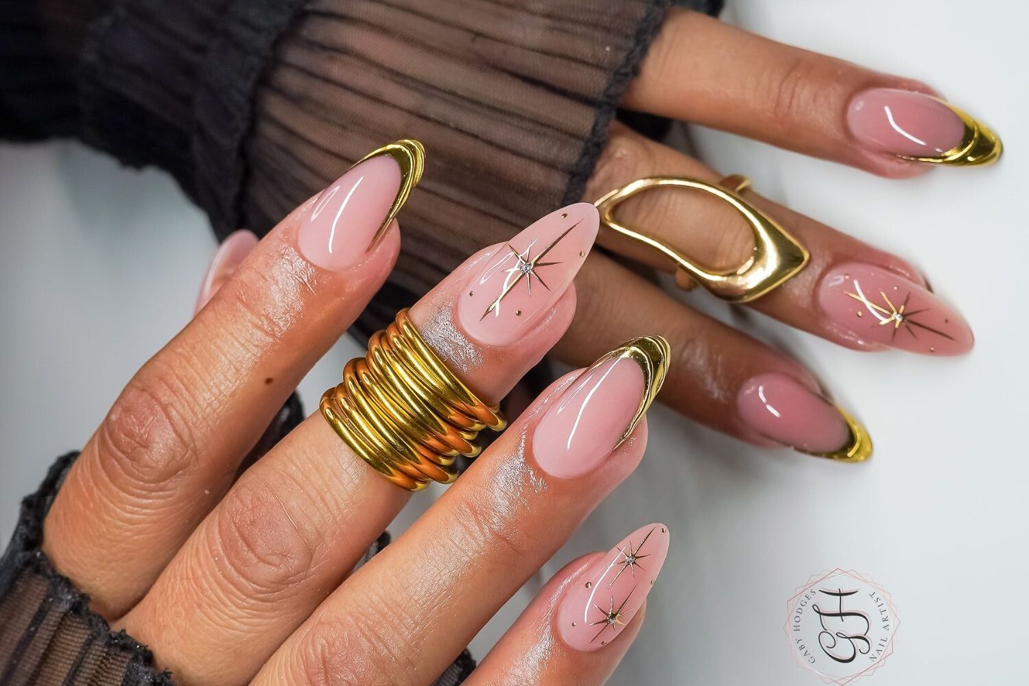 Combining gold french tip nails short with delicate starburst art, this design merges structure with seasonal charm. The metallic tips shine against a soft nude background, making it ideal for elegant nails lovers or new year gold nails inspiration. Pairs beautifully with gold accessories.