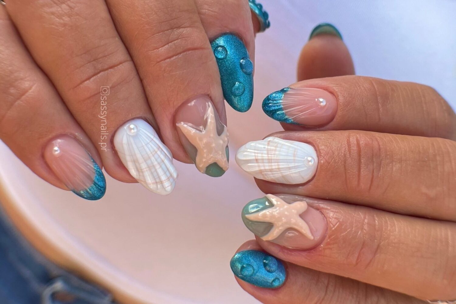 This playful take on mermaid theme nails brings together pearlescent shell details, beige starfish accents, and ocean blue shimmer. The textures on these mermaid nail designs give them a 3d effect, perfect for fans of beach vacation ocean nails. Great for medium skin tones and ideal for showcasing mermaid nail art with personality.