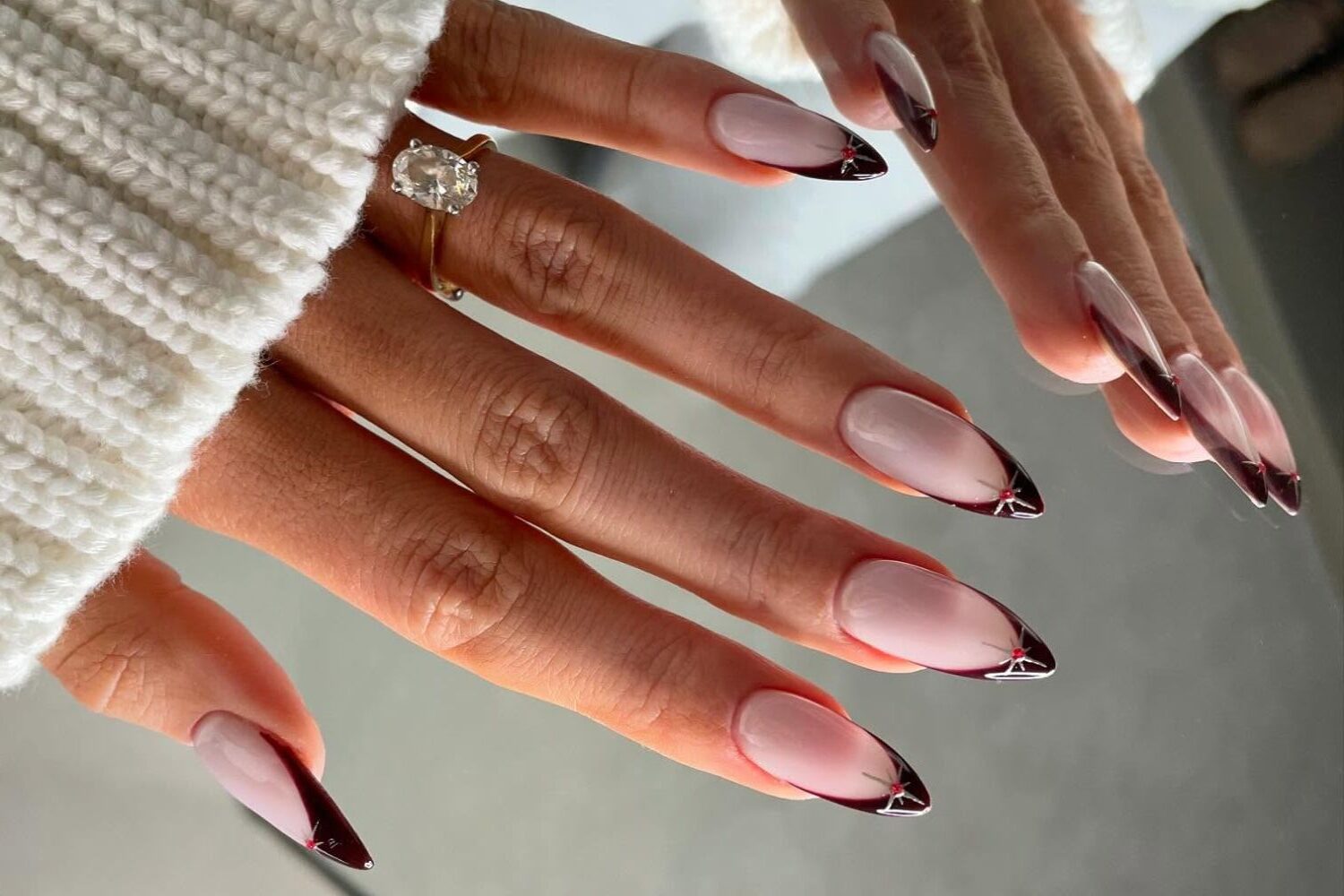 Deep wine-toned french tips get an upgrade with fine star accents, blending classic and trendy. This set fits well into november fall nails and offers a dramatic choice for november birthday nails or evening events. Best suited for almond or stiletto shapes and complements deeper skin tones beautifully.