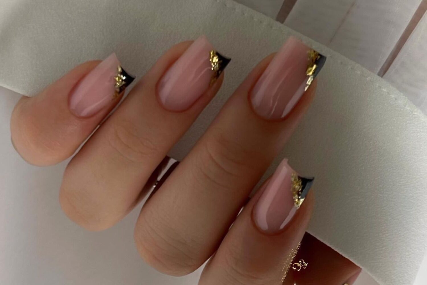 Black-tipped square prom nails with a touch of gold foil offer contrast and drama. This design walks the line between classy and edgy, perfect for a bold prom statement. Best suited for medium to deep skin tones and pairs well with black or gold gowns.