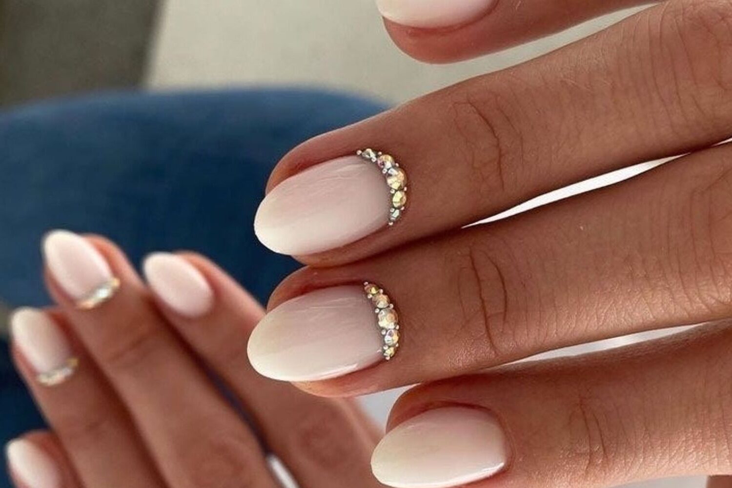 A soft pink to white ombré finish is elevated with subtle rhinestone accents. This timeless design is ideal for nails for bride wedding day style, offering a refined look that works for all skin tones.