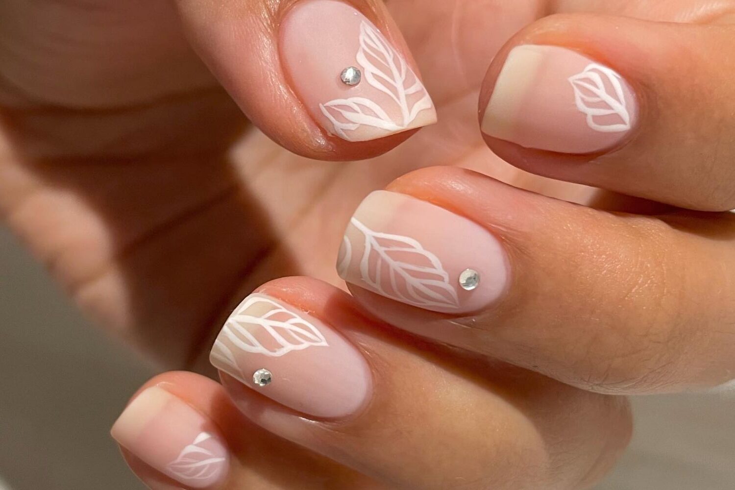 A matte pink base with crisp white leaf outlines and single crystals brings fresh detail to a short, natural shape. This design is ideal for winter engagement nails or for a modern take on wedding party nails. The matte finish is flattering across skin tones and keeps the look grounded.